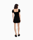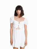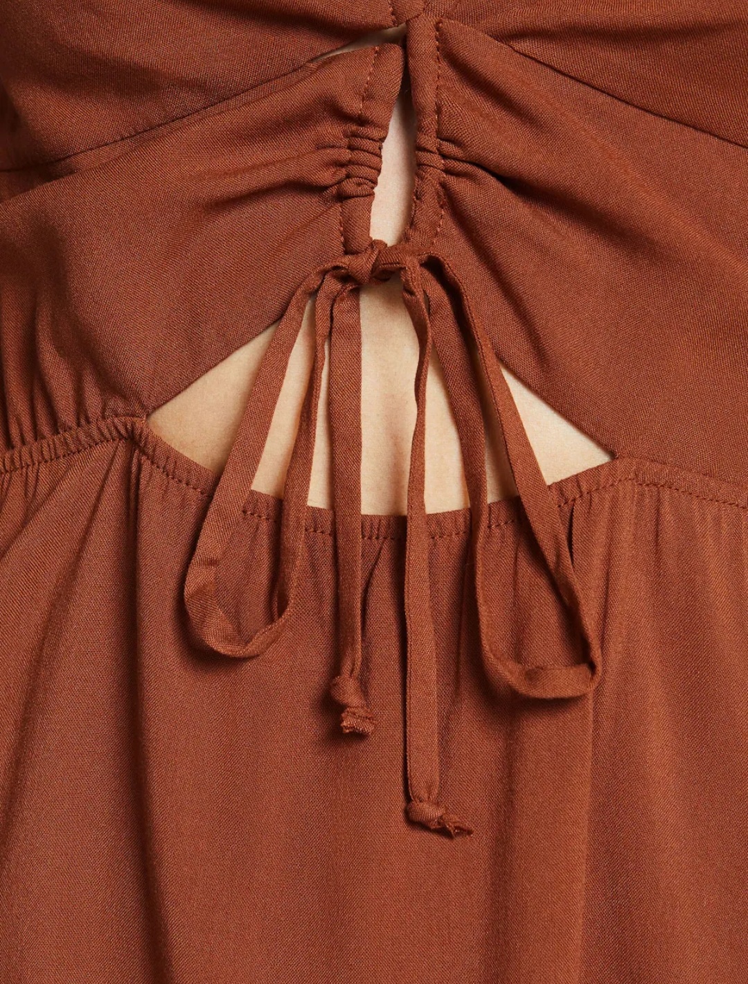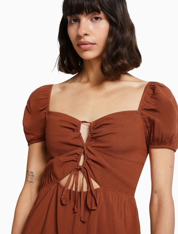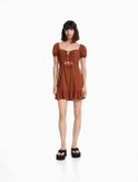 پیراهن زنانه کوتاه قهوه ای مشکی و سفید با آستین پفی و یقه گره ای ترند ۲۰۲۵