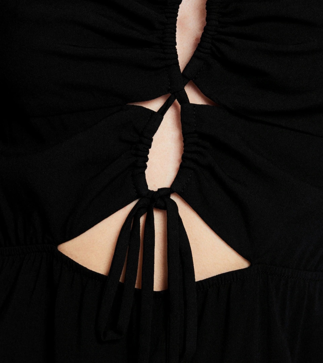 پارچه سبک و لطیف، باعث میشود لباس در تن حالتی راحت و خوشفرم داشته باشد. قسمت جلو با بند قابل تنظیم طراحی شده تا بتوانید میزان چینخوردگی و باز بودن یقه را مطابق سلیقه خود تنظیم کنید. دامن چیندار نیز به لباس فرم زنانهتر و لطیفتری میدهد.