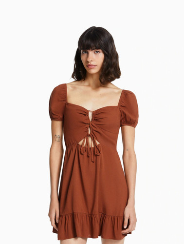 پیراهن زنانه کوتاه قهوه ای مشکی و سفید با آستین پفی و یقه گره ای ترند ۲۰۲۵